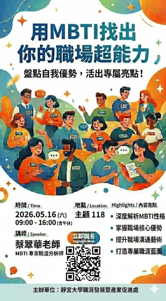 【職產處職輔工作坊】05/16(六)09:00-16:00 用MBTI找出你的職場超能力